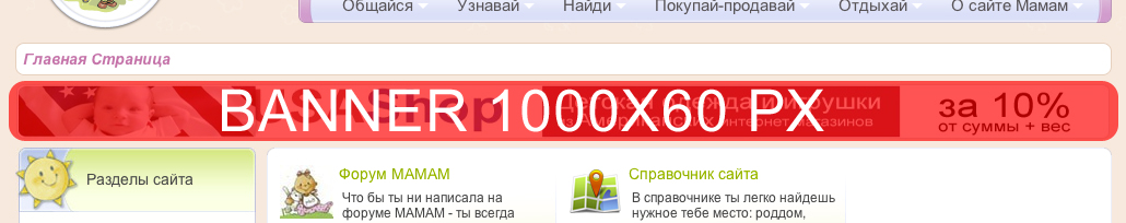 - Ваш баннер размером 1000х50 пикселей в верхней части сайта на всех страницах сайта Мама и на форуме со ссылкой на Ваш сайт.
